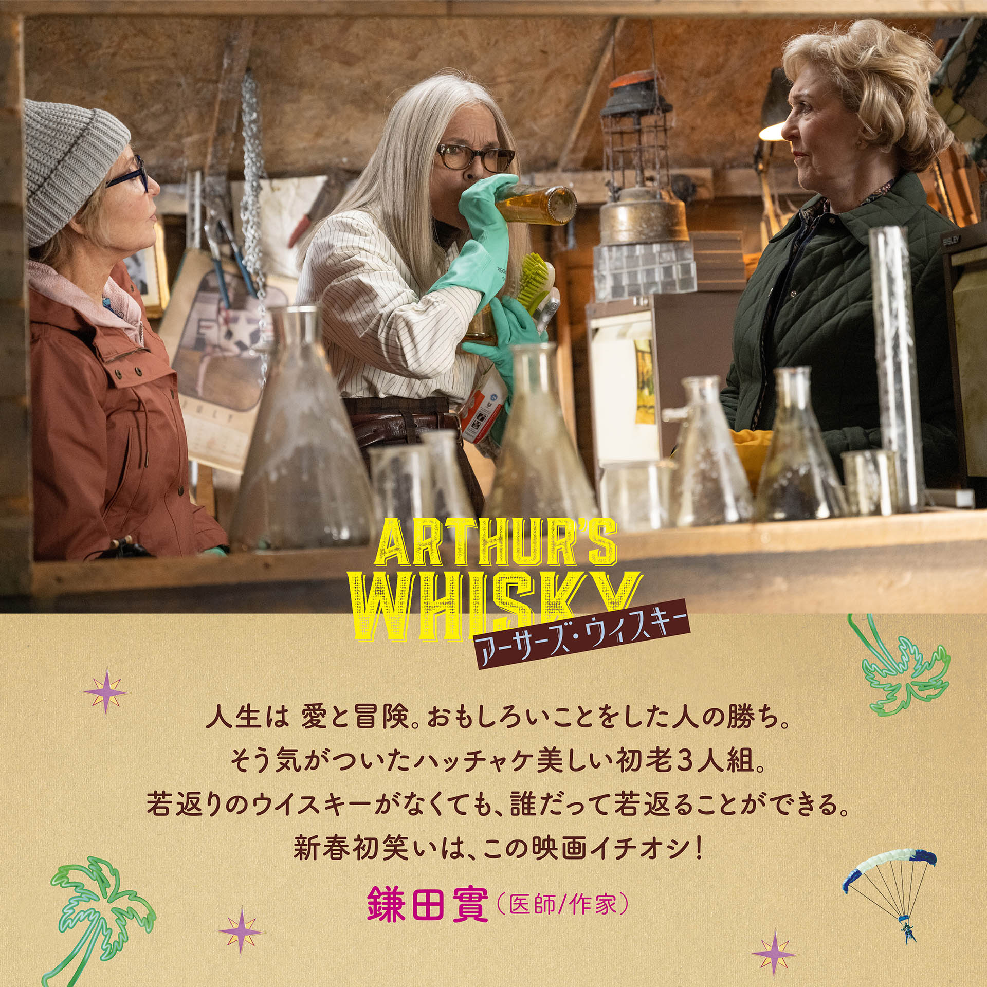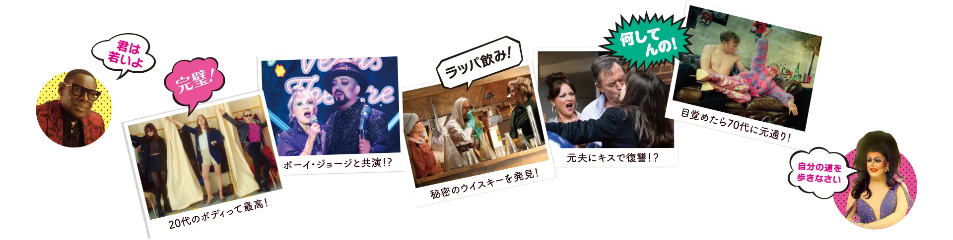 イギリス郊外、嵐の夜。アマチュア発明家アーサーは画期的な発明を完成させた途端、落雷に見舞われ亡くなってしまう。彼の葬儀後、妻のジョーン(パトリシア・ホッジ)は友人リンダ(ダイアン・キートン)とスーザン(ルル)の手を借りて、アーサーの小屋を大掃除していると、ウイスキーのボトルを発見する。3人はリビングで、老いた体を嘆きながらウイスキーでアーサーに向けて献杯すると、そのまま寝入ってしまう。翌朝、目覚めた3人はお互いの顔を見て叫び、若返った自分の体を見て驚きと嬉しさを爆発させる。アーサーが発明したのは、若返りのウイスキーだった。若返った3人はカフェに向かい、若くなった体でやりたいことリスト(バケットリスト)を作成する。しかし、若返りの効果が切れ始め、急いで店を出て行く。次は、体だけでなくファッションやメイクも今風に順応させて、3人の“ガール”たちはクラブへと繰り出す。久しぶりのクラブで、ダンスや強いお酒を楽しんだものの、飲み過ぎた3人は失態してしまう。特にスーザンはDJと強いお酒を飲み合いソファで寝てしまうと、翌朝元の姿に戻ったスーザンの姿を見たDJは飛び上がって驚く。